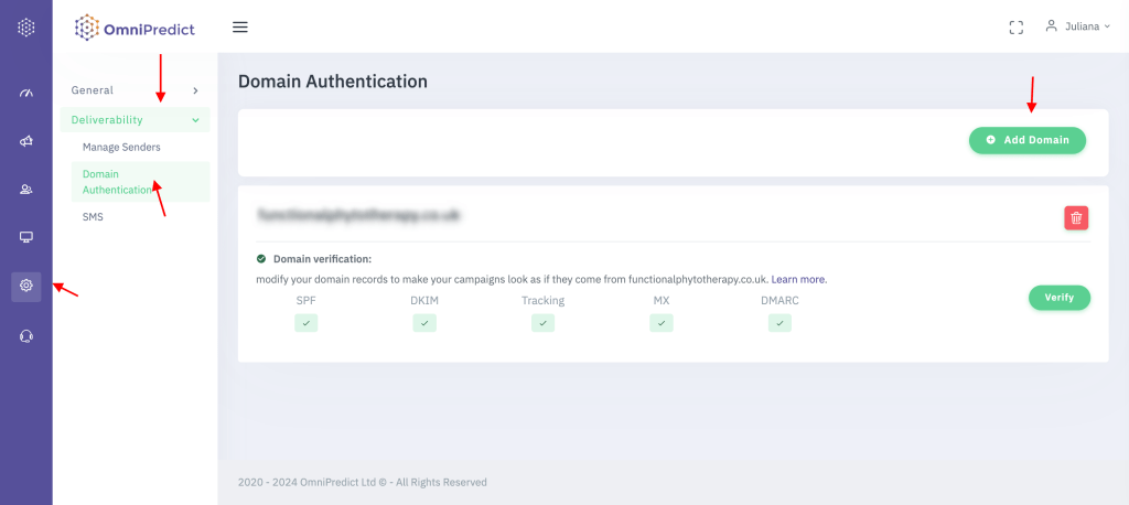 To verify your domain, navigate toย Settings> Deliverability> Domain Authenticationย screen:
