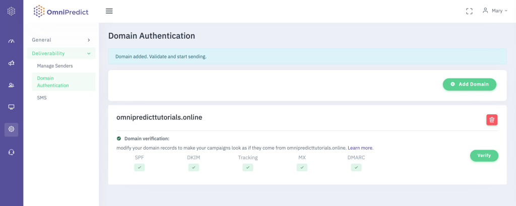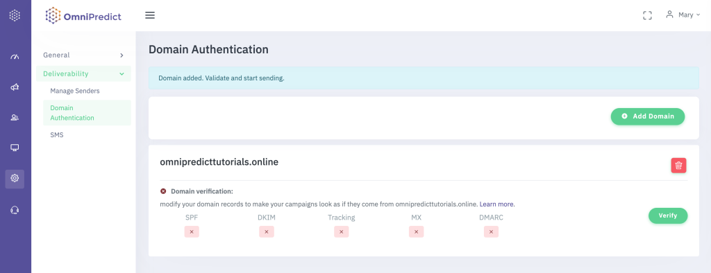 The following screen displays detailed information about your domain’s verification status. After adding all the required host records, return to this page and click ‘Verify’ to ensure that all records are marked in green.