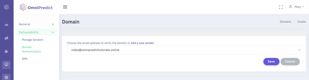 On this screen, you can select the domain name you wish to verify, based on an associated verified email sender. First, you must verify the email sender, then proceed with the domain verification. This same process applies to multiple email senders and multiple domains.