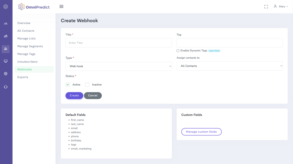 - Tags and Custom Fields: Enhance your webhook by adding tags which can be used to trigger specific automations within OmniPredict. Additionally, you can define custom fields to capture more detailed information about each contact.