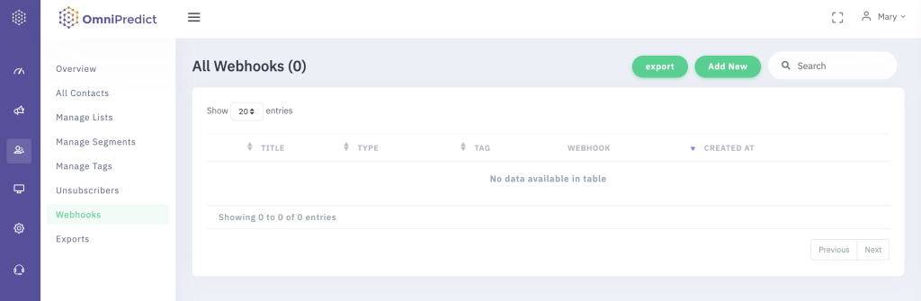 From your OmniPredict dashboard, go toย Contactsย >ย Webhooksย >ย Add new. This path will lead you to the webhook configuration area where you can begin creating a new webhook.